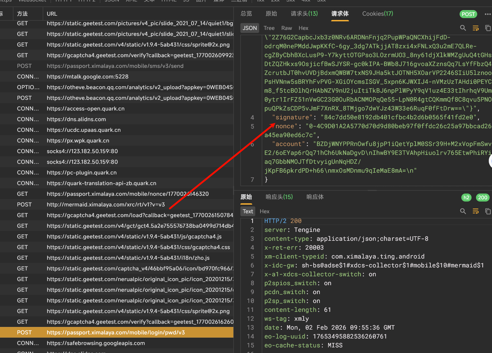 当抓到 login 这个包的时候,会发现在请求体中有一个 signature 的参数,今天我们的目标就是它