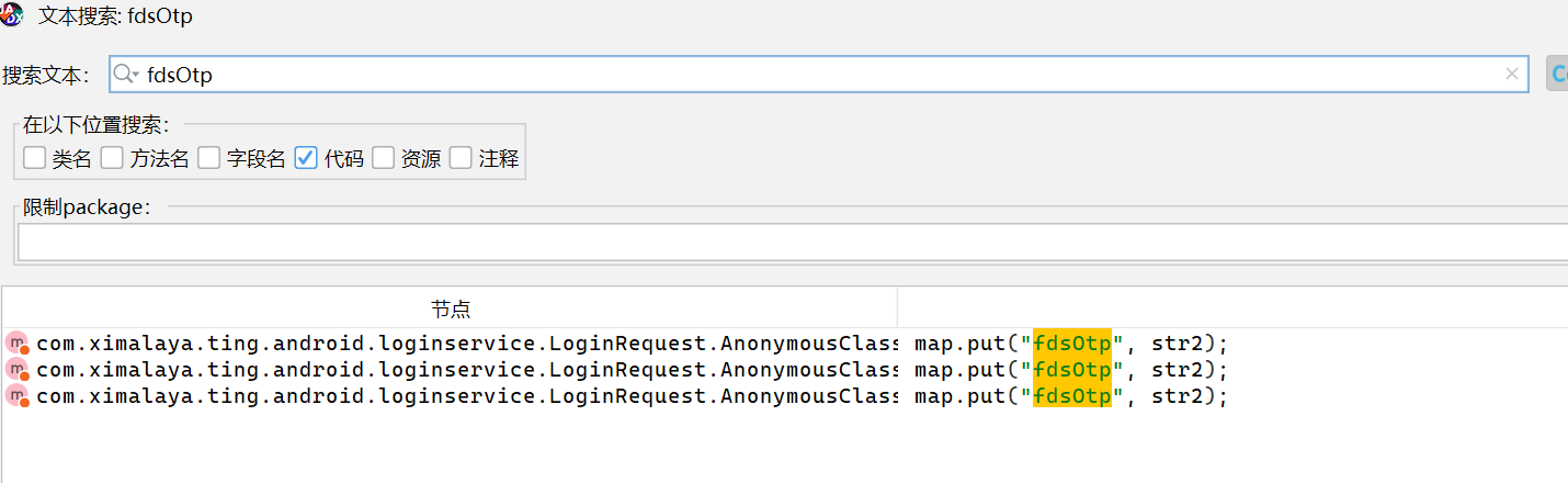 打开 jadx,搜索一下 signature 这个字段,但是发现搜索出来了很多关键词,那就拿其他相关的关键词进行搜索fdsOtp 这个字段挺特殊的,直接在 jadx 中搜索,发现了 3 个地方