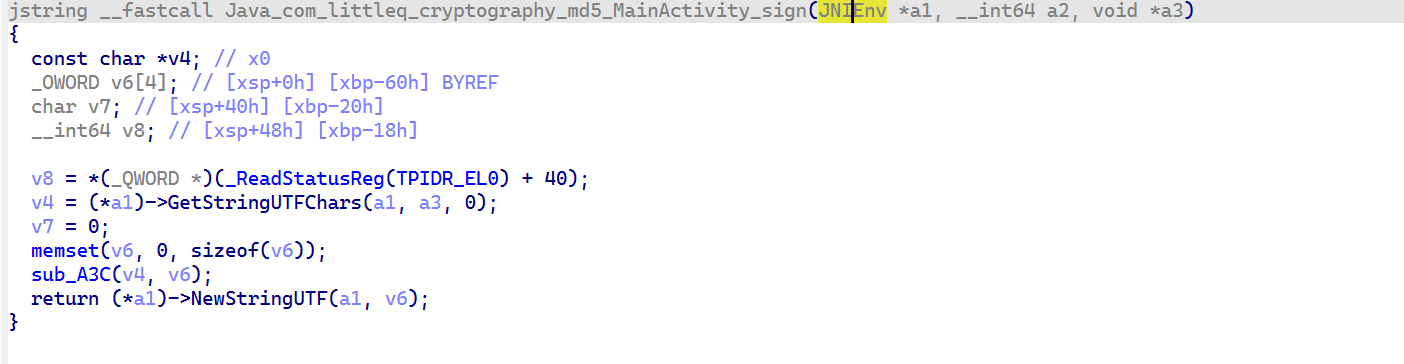 首先通过 GetStringUTFChars 得到 java 层的字符串,转成 c 语言字符串,得到输入的值给 v4