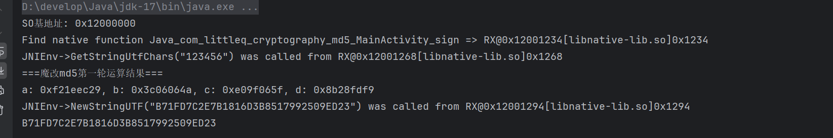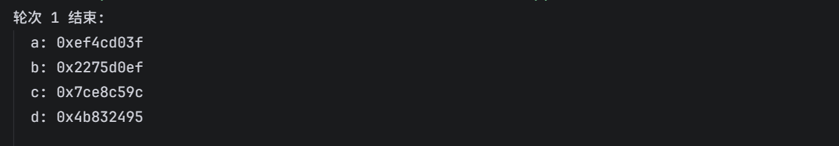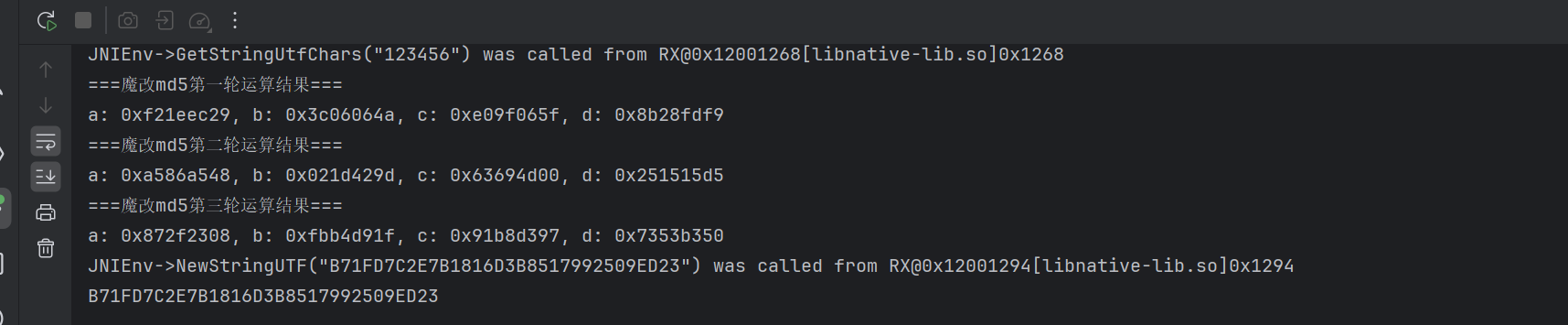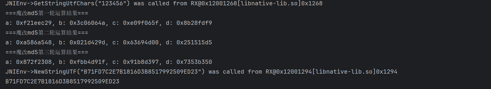 接着,我去 unidbg 打印一下魔改之后的 A,B,C,D 的值